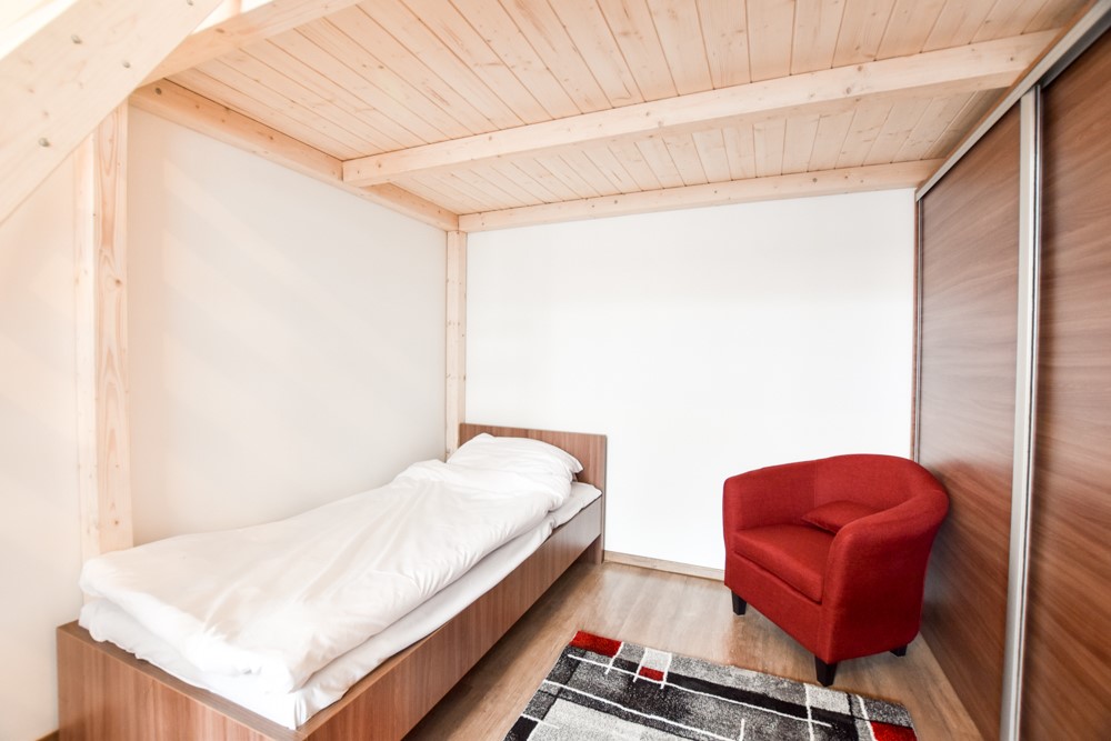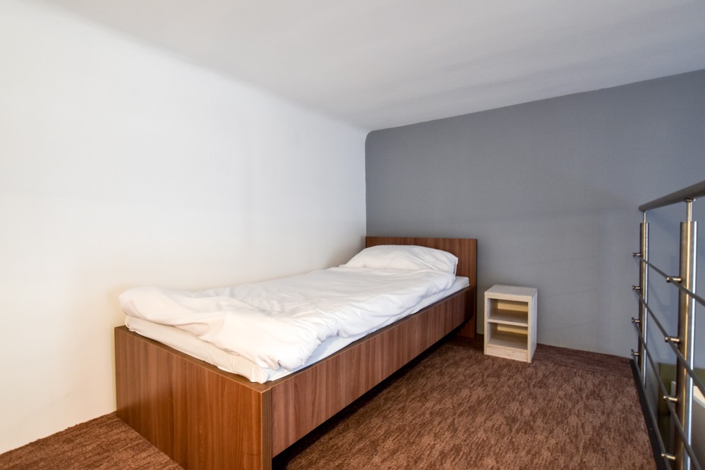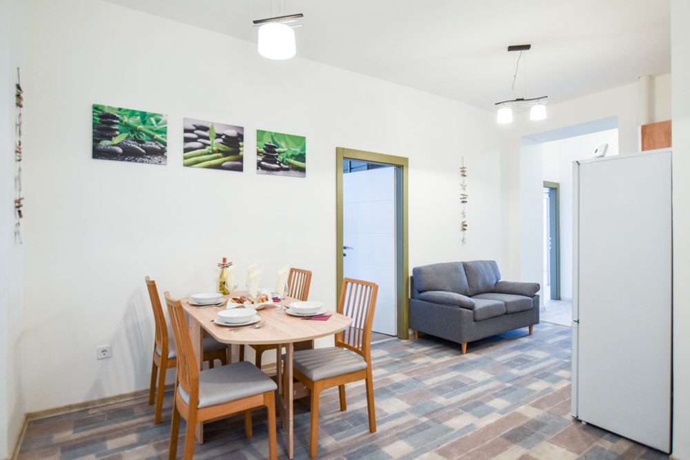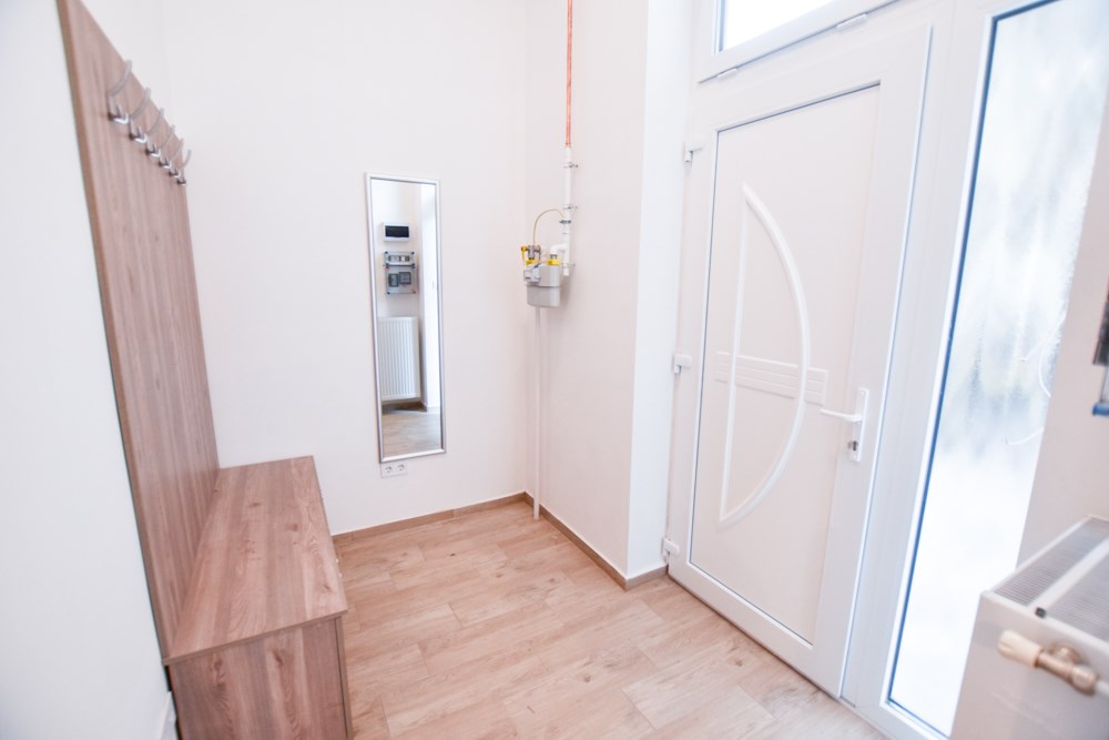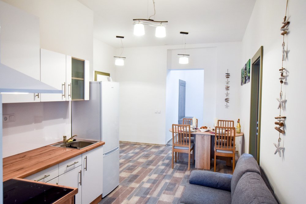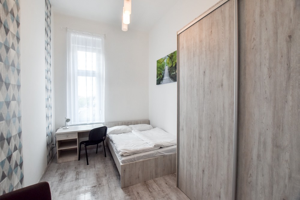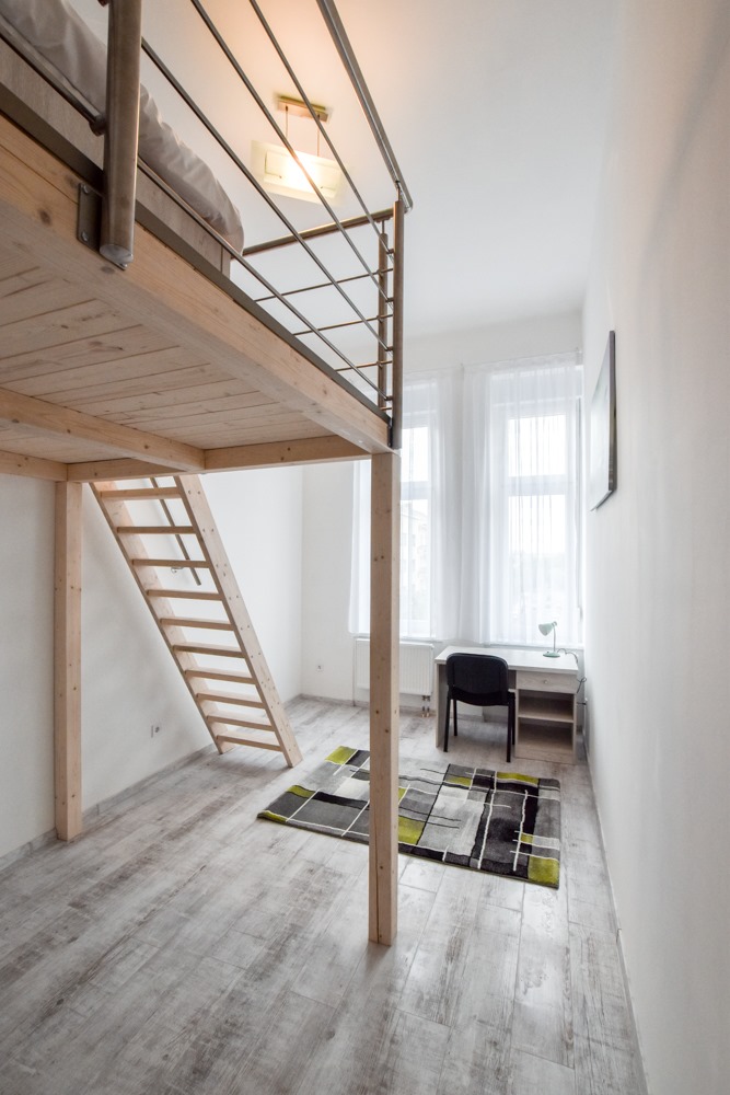 The apartment features five private bedrooms, each furnished with a bed, desk, wardrobe, and chair—perfect for privacy and productivity. A large, fully equipped kitchen serves as the heart of the home, with ample counter space, dining area, modern appliances, and all essential cookware. The property also includes a clean, shared bathroom and offers high-speed internet, a washing machine, and plenty of natural light throughout. With its warm, functional layout, the Nefelejcs Flat provides a welcoming and efficient space for daily living.